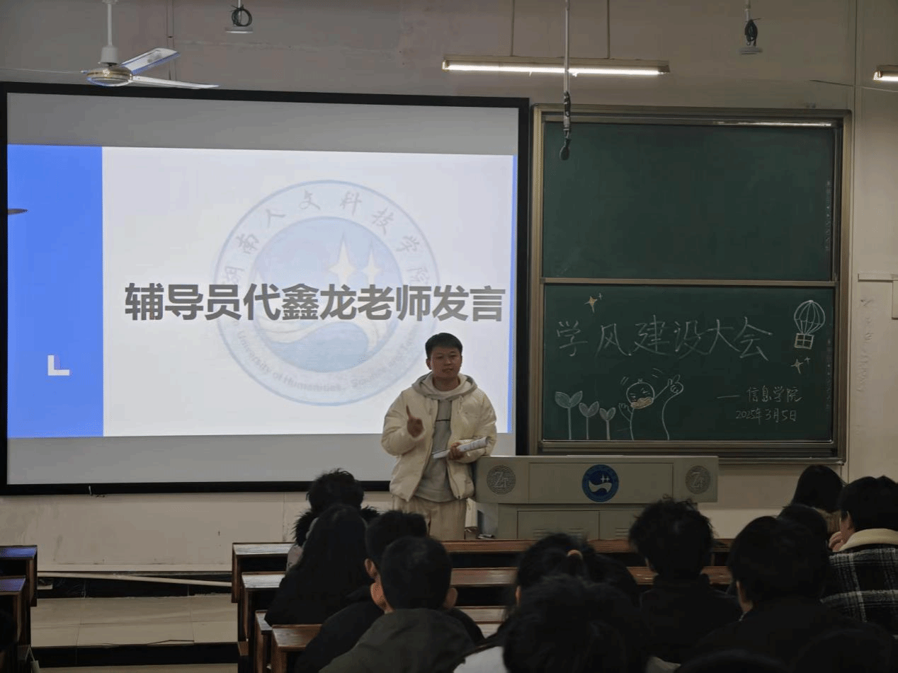 2025 年 3 月 5 日,信息学院于百全楼 103 召开本学期首次学风建设大会,聚焦学校本科评估、学风建设、安全教育三大关键工作。学院辅导员杨艺蕾、代鑫龙及全体在校班委代表参会,共商学院学风提升与发展路径。