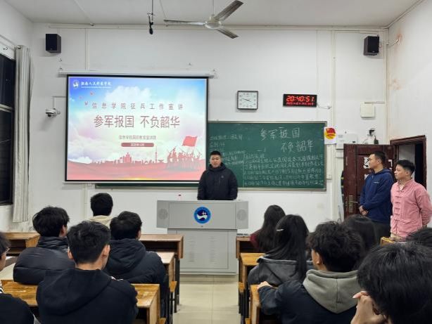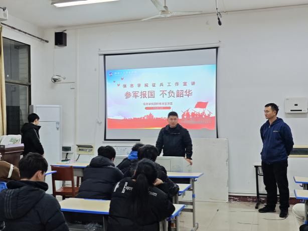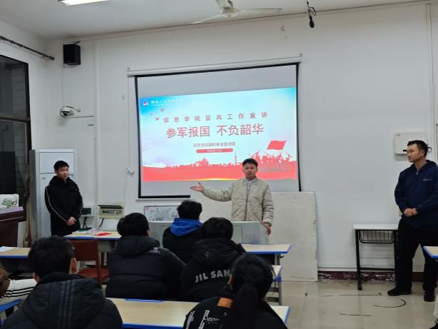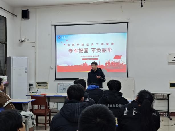 为厚植学子家国情怀、激发参军报国壮志,2025年12月,信息学院国防教育宣讲团以“参军报国,不负韶华”为主题,开展征兵宣传系列活动。