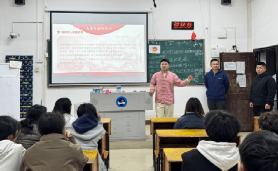 12月17日,指导老师代鑫龙与宣讲团成员24级计科2班陈玉汪、24级人工1班臧跃翔深入各班级开展国防教育主题班会,为同学们解读征兵政策、体检标准及入伍流程,让参军理念更具体可感。12月23日,学院宣讲团在百全楼310举办专题讲座,22级计科4班范志豪、24级计科2班陈玉汪、24级人工1班臧跃翔结合自身军旅经历,分享部队收获与经验,针对性解答学业衔接、部队选拔、发展前景等学子关切问题。代鑫龙在总结中号召同学们投身军营,书写别样青春。