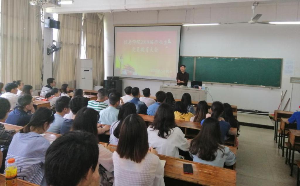 2019年5月10日下午3点,在百全楼103教室,信息学院党总支组织召开2019届毕业生党员教育大会,党总支书记谭甲凡和各学生支部书记参加会议。