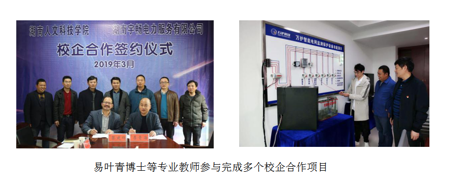 近年本专业立足学校“地方性、应用型、开放式”高水平应用技术大学的办学定位,紧密结合行业企业对专业人才的能力与素质要求,深入开展校企合作,稳步推进产教融合,将创新创业教育融入人才培养的全过程,成效显著。以易叶青博士为主先后采用先进的计算机、电气自动化控制、物联网等多种高新技术在电力故障检测、预警和保护等方面完成了多个合作项目。