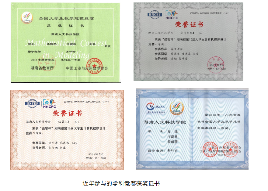 本专业学生在大学期间可以参加挑战杯、互联网+大学创业竞赛、机械设计大赛、ACM程序设计、机器人高尔夫、机器人接力赛、数学建模等学科竞赛和研创项目,近年取得成绩显著。由易叶青老师指导的学生获得全国数学建模湖南赛区一等奖和全国一等奖。其次还获得湖南省程序设计大赛软件开发项目一等奖、机器人高尔夫二等奖等多项奖励。