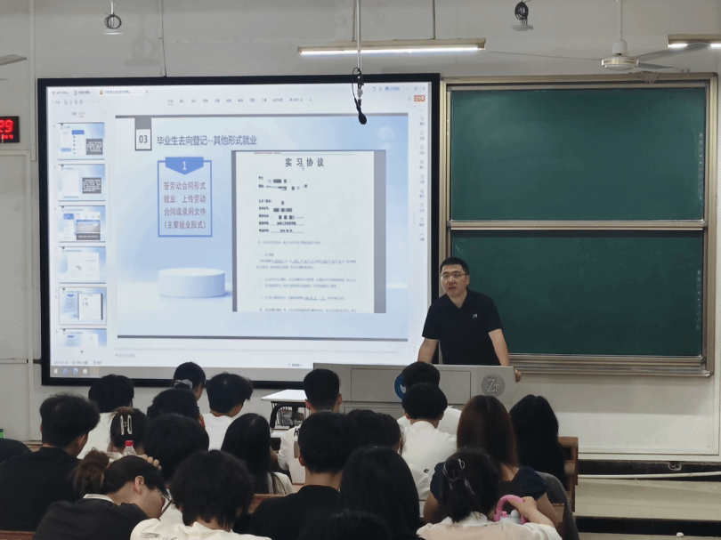 本次会议紧密围绕大四学年相关工作及注意事项展开,进行全面部署。会议重点强调了毕业生档案填报要、宣传解读国家及地方最新的征兵入伍政策、讲解毕业生就业信息服务平台操作流程、强调学生在校期间及离校过程中的安全防范。
