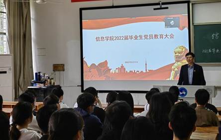 517日下午三点,信息学院党总支在百全楼103召开了2022届毕业生党员教育大会。信息学院党总支书记谭甲凡、副书记刘宗良、学生第二党支部书记颜聪玲以及18级全体党员(线上线下同步)参加会议,会议由颜聪玲主持。