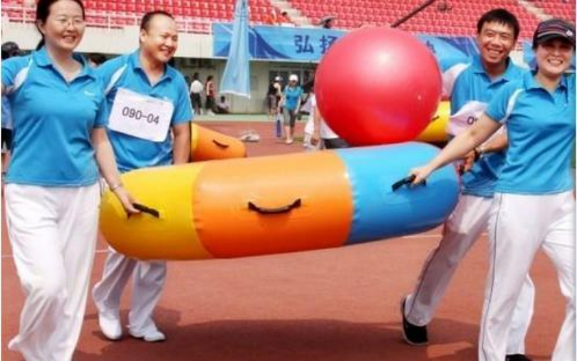 项目简述:每队派出10名队员分成两组。比赛开始前,5 名队员手握把手提起器材,站于起点,听裁判发令后,5 名队员通过协作配合将器材上的球运送到50米标志杆处,再更换5名队员,再次通过协作配合将器材上的球运送回来,以各参赛队比赛器材触及终点线所在垂直平面为计时停止,用时最少者名次列前。运送过程中如果球掉地上,球在什么地方掉下必须在什么地方捡起放好再继续开始。在标志杆处更换队员时可以手扶球,运送过程中如果有任何队员或本工会小组的人用手或物体接触球,则每次加时间10秒。
