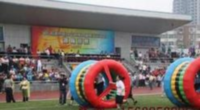 项目简述:每队派出14名队员分成两组。比赛开始前1名队员站在圆环里面,另外六人分别站于器材左右与后面,立于起跑线后,听裁判发令后,7 名队员通过协作配合使比赛器材在跑道上滚动式前进,到达50 米标志杆后,更换7名队员,再次通过协作配合使用比赛器材在赛道上返回。以各参赛队比赛器材触及终点线所在垂直平面为计时停止,用时最少者名次列前。