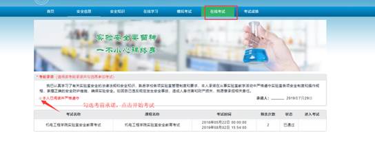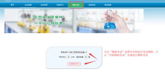 4、考试次数及达标分数。本次安全考试系统设定的每个学生可考试次数为5次(最后成绩取最优成绩),达标分数为85分。请同学们在规定的时间内登录系统在“安全知识”中选取相应模块进行线上学习、在线模拟考试合格后再进入到考试系统考试,只有安全知识考核达标的学生才允许进入实验室进行实验。