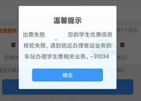 当学生买票在12306买票时提示优惠信息核验失败时(如下图3、图4所示),请学生在资质查询里仔细核查所绑定的优惠区间(如图1所示)是否是正确的站点名称,若发现绑定站点不正确或与实际乘车区间(学校--家庭)不符时,请尽快找老师修改优惠卡内站名名称,然后去车站自助机刷身份证、优惠卡重新绑定资质信息,重新绑定资质以后12306上资质信息区间修改成功后才可以买票!