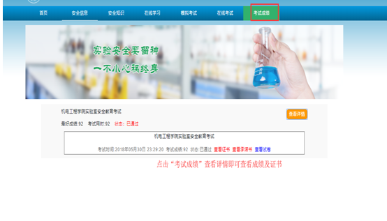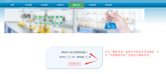 4、考试次数及达标分数。本次安全考试系统设定的每个学生可考试次数为3次,达标分数为85分。请同学们在规定的时间内登录系统在“安全知识”中选取相应模块进行线上学习、在线模拟考试合格后再进入到考试系统考试,只有安全知识考核达标的学生才允许进入实验室进行实验。
