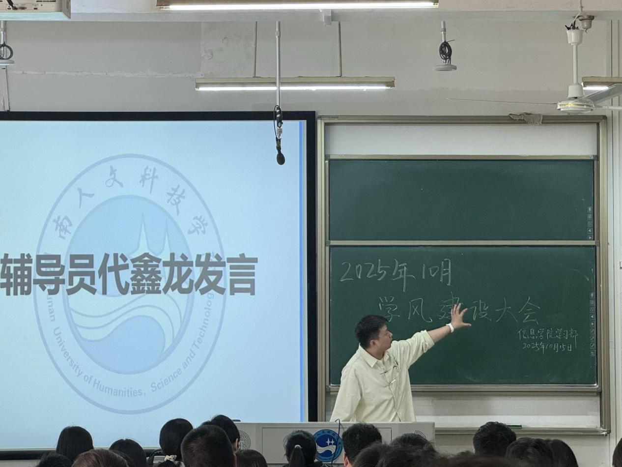 为营造良好学习氛围,打造优良上进的学风并积极迎接师范认证工作,信息学院于2025年10月15日中午在百全楼103召开学风建设大会。党总支副书记朱舒腊,辅导员代鑫龙、杨艺蕾、付妙、李海艳与各班主要班委参与会议。