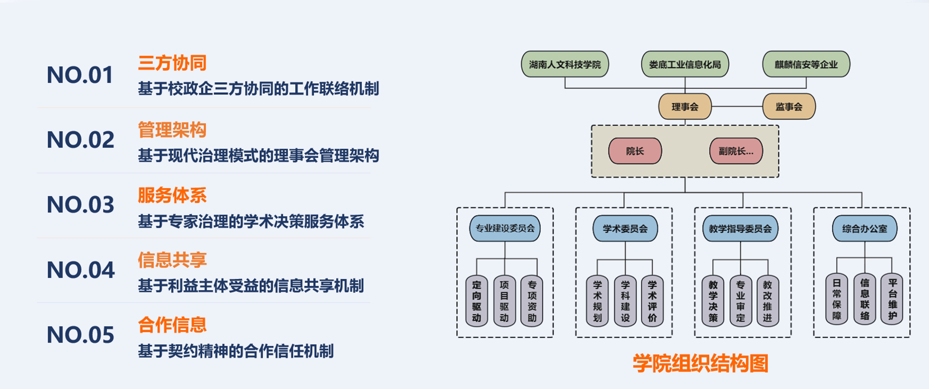 5、基于契约精神的合作信任机制。现代产业学院在深化产教融合、校企合作的模式改革中,充分实现优势资源互补,学校和企业在价值取向、评价机制等方面建立起合作互信机制。