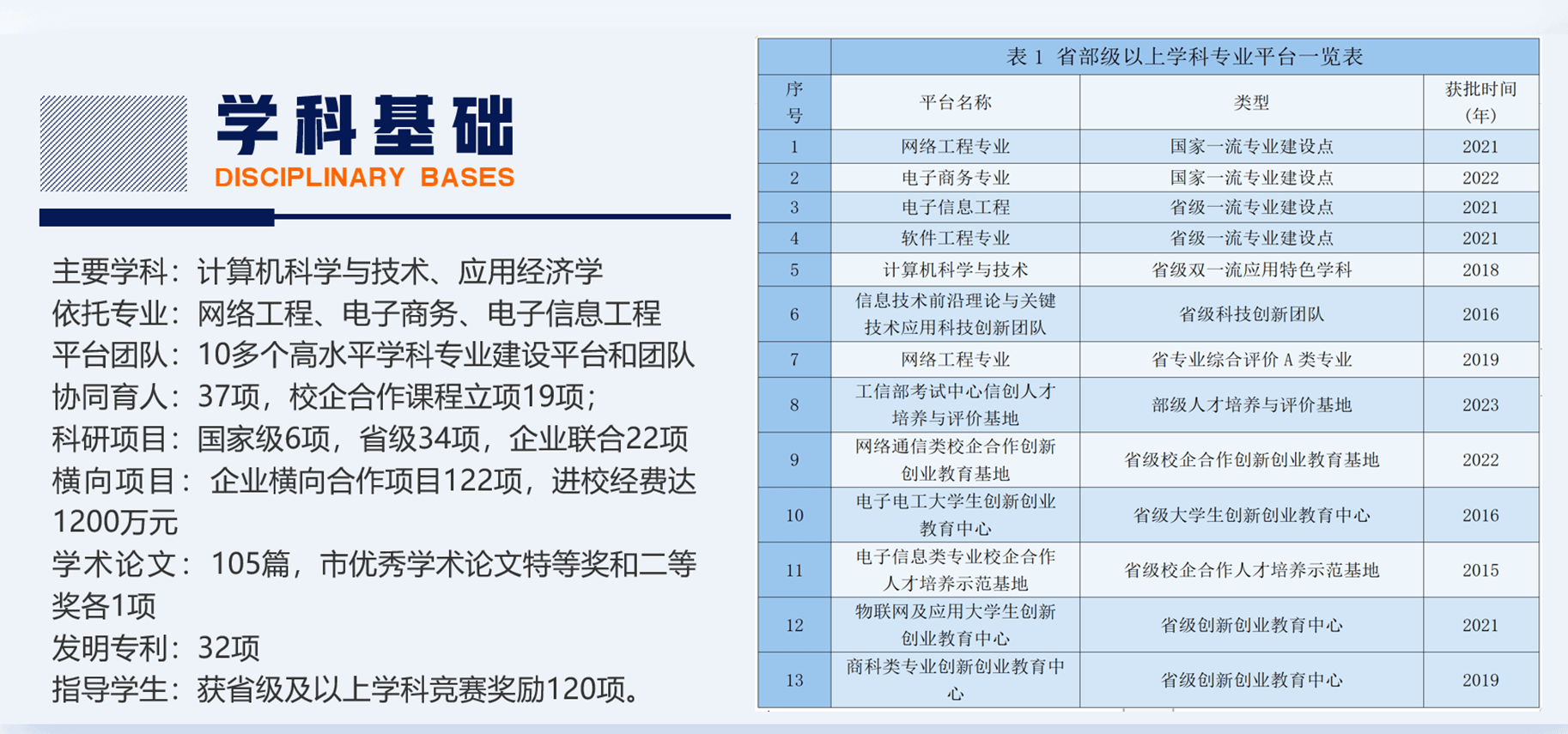 学院依托的主要学科是计算机科学与技术、应用经济学。计算机科学与技术学科是湖南省十一五、十二五重点建设学科,是湖南省十三五、十四五双一流应用特色学科;应用经济学是湖南省十三五、十四五双一流应用特色学科。