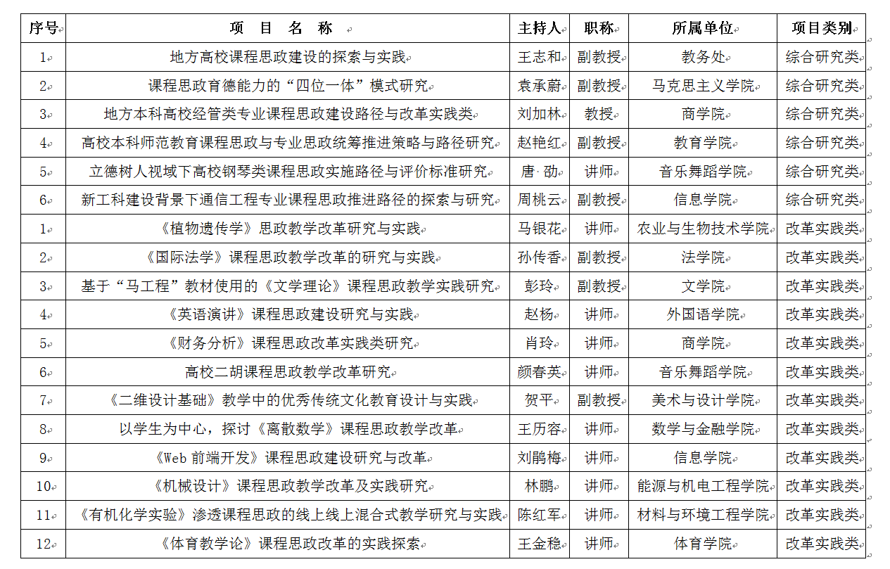 根据湖南省教育厅《关于做好2020年湖南省普通高等学校课程思政建设研究项目申报工作的通知》(湘教通〔2020〕176号)和学校《关于做好2020年湖南省普通高等学校课程思政建设研究项目申报工作的通知》(校教通〔2020〕58号)的文件精神,经教师申报,学校评审,现对拟推荐申报2020年省级课程思政教学改革研究项目进行公示。公示期间,对评审结果有异议的组织和个人请以书面形式向教务处反映。反映问题应实事求是,并尽可能提供具体情况,一经核实取消推荐资格。公示时间从8月12日至8月19日。