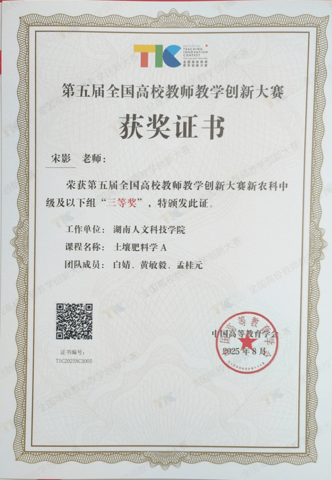8月16日至19日,由教育部高等教育司指导、中国高等教育学会主办的第五届全国高校教师教学创新大赛决赛在北京举行。beat365农业与生物技术学院宋影教师团队荣获全国三等奖。