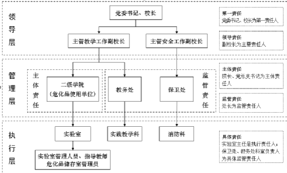 党委书记、校长、副校长,对学校危险化学品管理负领导责任,其中党委书记、校长为第一责任人,副校长为主要责任人。