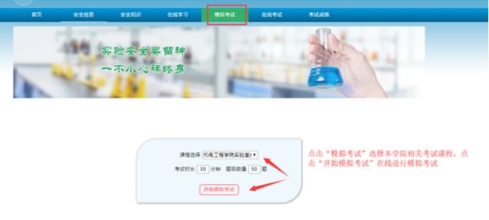 1、请同学们在规定的时间内登录系统在“安全知识”中选取相应模块进行线上学习、在线模拟考试合格后再进入到考试系统考试,只有安全知识考核达标的学生才允许进入实验室进行实验。