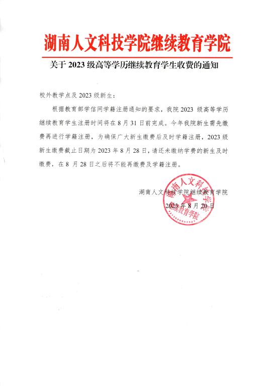 根据教育部学信网学籍注册通知的要求,我院2023 级高等学历继续教育学生注册时间将在8月31日前完成。今年我院新生需先缴费再进行学籍注册,为确保广大新生缴费后及时学籍注册,2023级新生缴费截止日期为2023年8月28日,请还未缴纳学费的新生及时缴费,在8 月28日之后将不能再缴费及学籍注册。