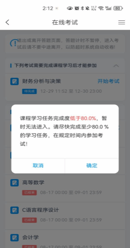4、学习任务未完成的课程,会显示在下图所示列表中。须完成课程学习任务后才能参加考试,点击开始考试将弹出提示语。