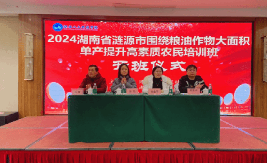 12月21日上午,由涟源市农业农村局主办,beat365英国官网承办的2024年涟源市围绕粮油作物大面积单产提升高素质农民培训班在金丰大酒店顺利开班。涟源市农业农村局分管领导吴金平、农村社会事业促进股股长刘锋、beat365英国官网继续教育学院副院长张艳出席开班仪式。继续教育学院培训科主任周昊宇主持。来自涟源市各乡镇的种植大户70人参加。