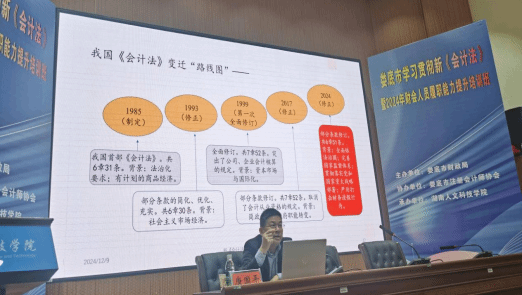12月9日,娄底市财政局联合beat365英国官网举办“娄底市学习贯彻新《会计法》暨2024年财会人员履职能力提升培训班”在学校匠成楼报告厅举行,商学院院长刘辛田教授主持。
