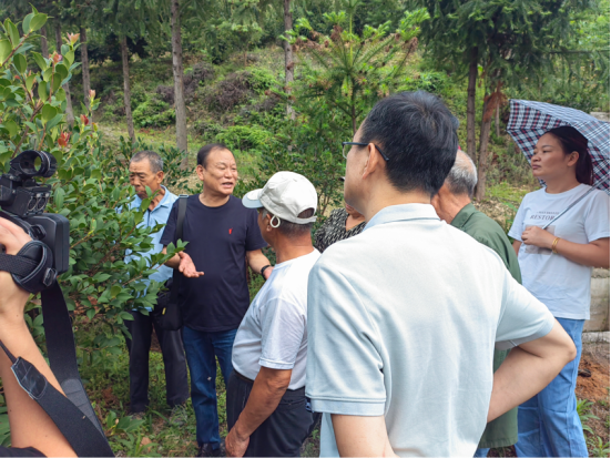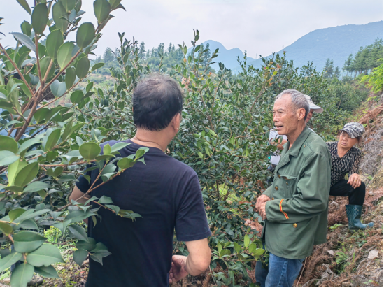本次的回访对象是68岁的村民邱小阳,他自2010年在老家种植了近80亩油茶后,2017年又承包了300余亩山地,由于缺乏技术,邱小阳报名参加了2022年湖南省高素质农民培育涟源市种养加技术能手培训班,多次邀请农技专家回村进行现场指导。今年5月,继续教育学院已进行过一次跟踪服务,了解到去年盛花期,邱小阳施了比较多的复合肥,但去年天气干旱,土地无法吸收肥料,于是今年雨季过后油茶树春梢旺长、树膛郁闭,导致今年油茶花的数量虽多、但花质差,掉花落果严重。