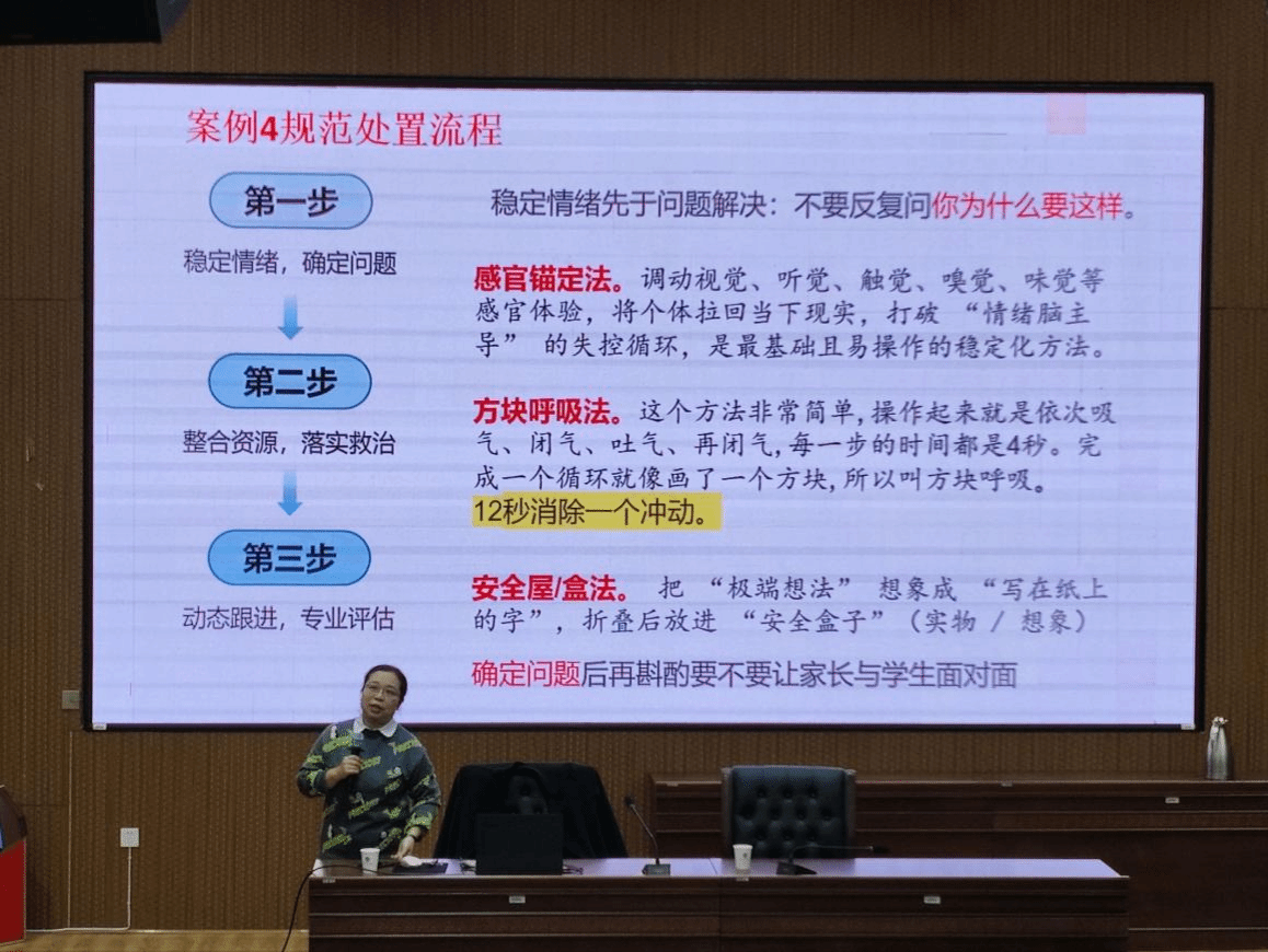 讲座聚焦实务难题,以“场景模拟+方法传授”模式展开。针对心理课堂组织、学生拒测应对、特殊家庭危机干预等高频问题,现场讨论方块呼吸法、安全屋技术等实用干预技巧;详解心理测评“知情同意”流程与课堂内容筛选标准;同时,盛青老师建议,同学们在开展危机干预工作时,要搭建跨部门协作沟通的桥梁,学会联动家庭、社区、公安等多方资源,以此提升在复杂场景下的专业处置能力与实操效能。