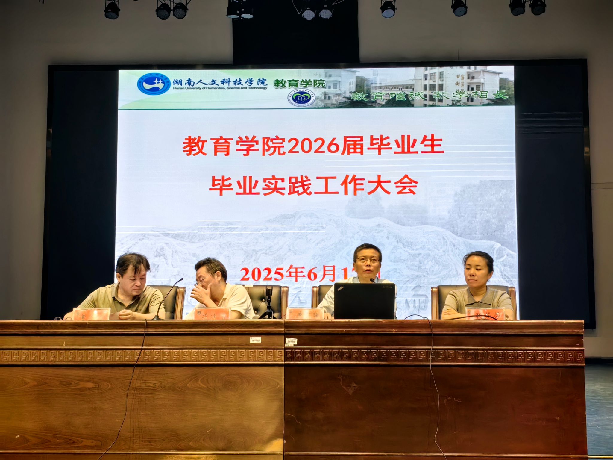 6月17日上午,教育学院在逸夫楼音乐演播厅召开了2026届毕业生毕业实践工作大会。大会由教育学院蒋冰清院长主持,张莎莎副书记、曹俊军副院长、李国强副院长、有关专业教研室主任、班主任、实习带队老师、辅导员、教务办主任、2026届(2022级)380余名师范生参加了大会。