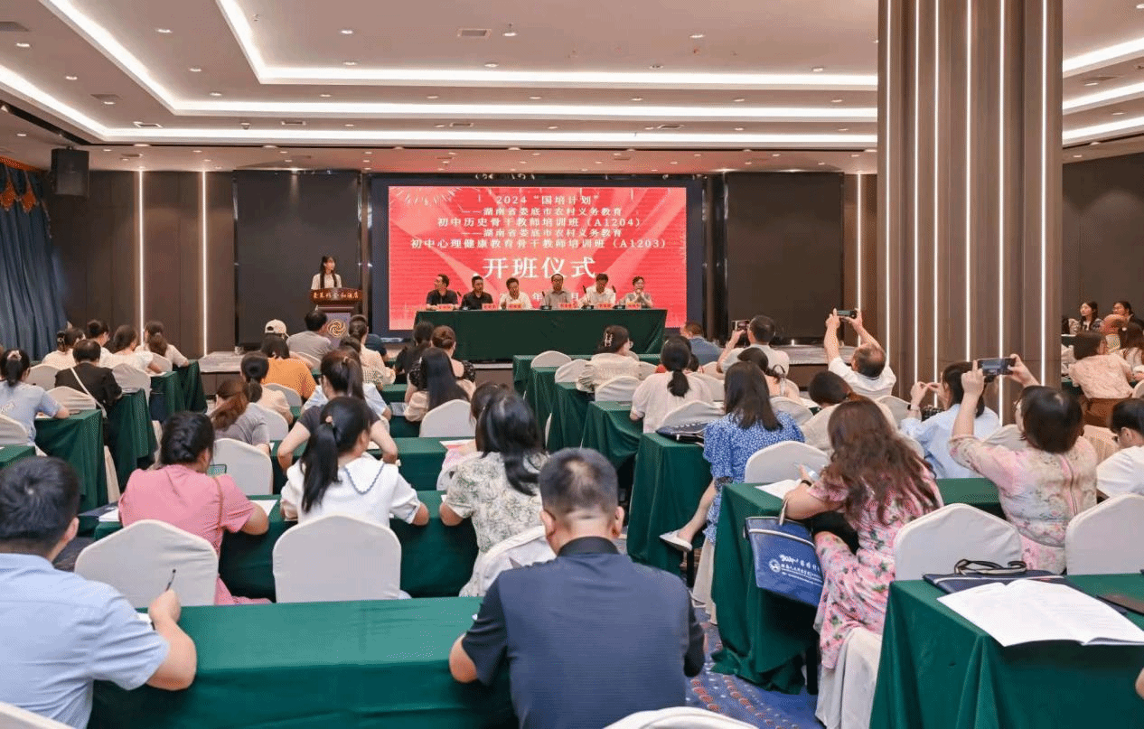 2024 年 8 月 5 日上午,beat365英国官网承办的2024“国培计划”——湖南省“娄底市农村义务教育初中历史骨干教师”与“娄底市农村义务教育心理健康教育骨干教师”培训开班仪式,在娄底豪莱雅金和酒店三楼金和厅隆重举行。