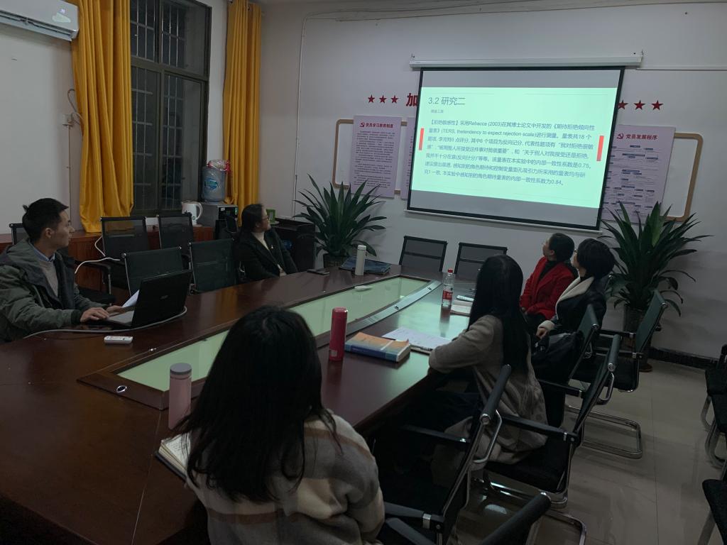 2019年11月18日星期一晚7:30-9:30,甘澍楼204室党员活动室内,在杨红君老师的精心组织下,教育学院数多位老师齐聚一堂,进行每周一次的学术研讨会。本周研讨会邀请了徐异老师就心理学顶级期刊(《心理学报》)中“寻求者的注视方向对建议者建议提出的影响”一文进行文献报告,教育学院赵艳红博士、胡小兰老师、苏小七老师、黎任水老师等出席了此次交流会。