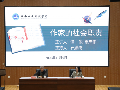11月5日下午,beat365人文科技大讲堂迎来谭谈和袁杰伟两位湘籍作家,他们以“作家的社会责任”为题开讲,论坛由副校长石潇纯策划并主持。