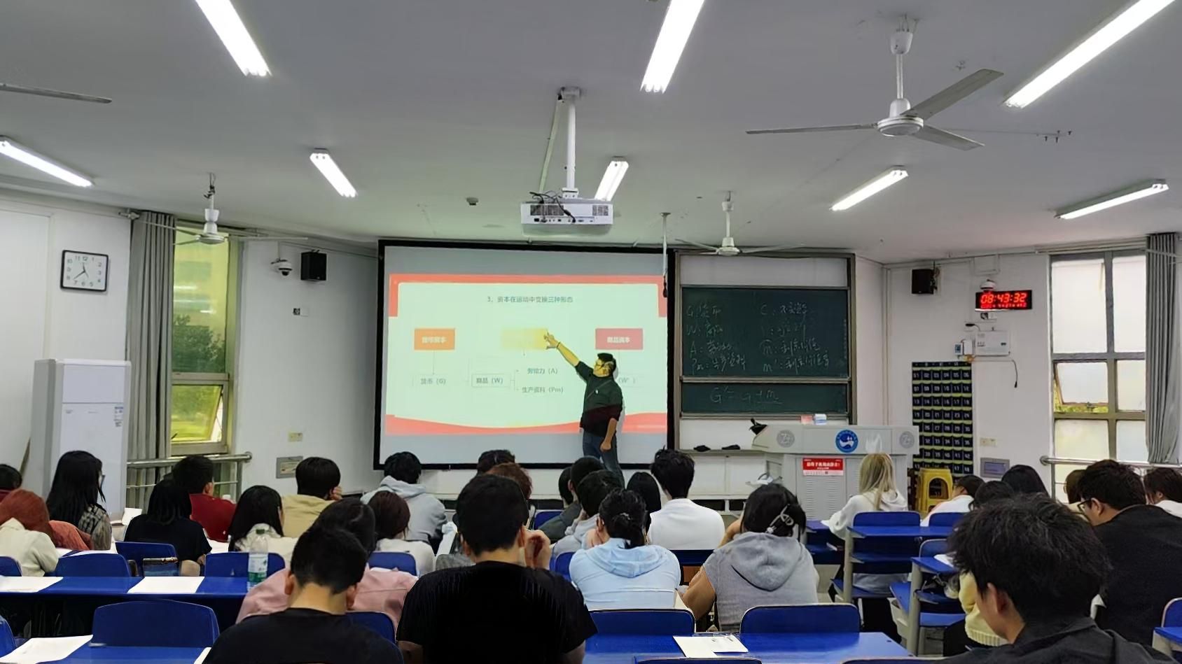 周艺紧扣 “剩余价值的实现与分配” 这一主题,将课程内容划分为 “剩余价值通过资本运动实现” 与 “剩余价值转化为平均利润及资本家无偿占有机制” 两大核心板块展开授课。他还通过播放相关视频等多元化教学手段,帮助学生深入理解抽象的概念,为学生带来了一堂生动的思政课。课程结束后,成赛军组织听课教师围绕教师教学表现、教学内容设计、德育功能渗透等方面进行研讨。与会教师高度认可周艺的课程设计与教育教学能力,同时针对授课内容提出细化知识点、增强课堂互动等建设性意见。