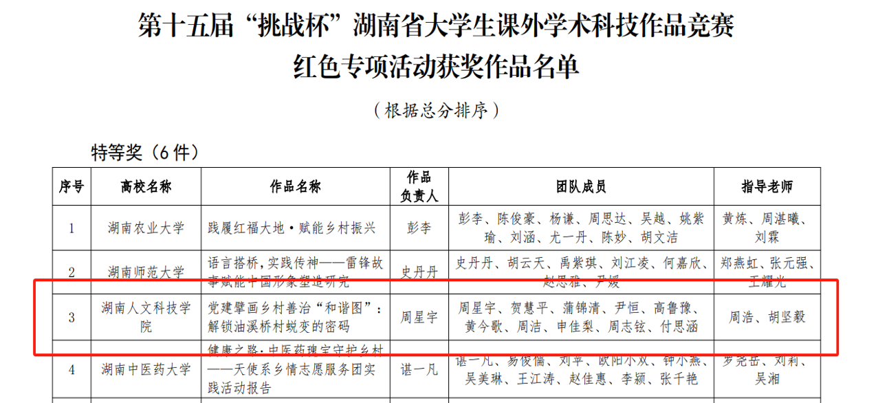 近日,第十五届“挑战杯”湖南省大学生课外学术科技作品竞赛红色专项活动省级获奖名单公布,我院2021级思政3班周星宇同学负责的团队作品《党建擘画乡村善治“和谐图”:解锁油溪桥村蜕变的密码》(指导老师:周浩 胡坚毅)荣获湖南省特等奖并入围全国交流活动。