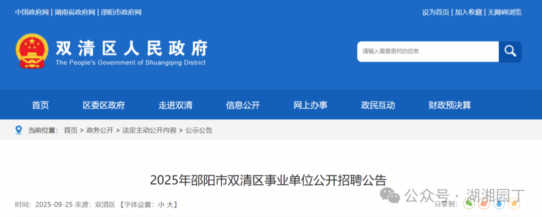 根据《事业单位人事管理条例》(中华人民共和国国务院令第652号)、《湖南省事业单位公开招聘人员办法》(湘人社规〔2025〕1号)、《邵阳市事业单位公开招聘人员实施细则》(邵人社发〔2019〕54号)和《关于修订印发〈邵阳市随军家属就业安置办法〉(试行)的通知》(邵市政发〔2022〕6号)等文件精神,邵阳市双清区所属事业单位面向社会公开招聘40名事业编制人员(具体岗位及要求见附件1),整个招聘工作按照制定方案,通过发布公告,现场报名、资格审查、笔试、面试、体检、考察、公示、聘用等步骤进行。查询相关信息请登录邵阳市双清区人民政府网查询(http://www.shuangqing.gov.cn)