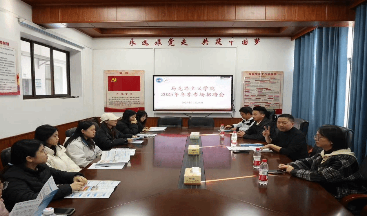 11月28日,马克思主义学院在若谷楼206会议室举办2026届毕业生专场招聘会。学院党总支副书记阳青、学工办主任张得才,长沙市麓谷高级中学等两所单位的招聘团队及2022级思想政治教育专业部分学生参加本次活动。