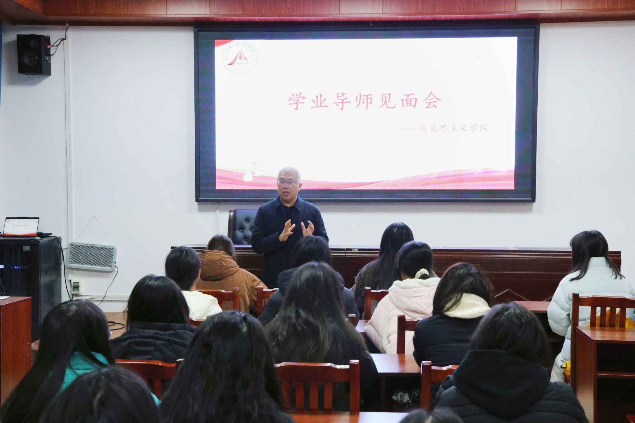 12月11日至12月14日,马克思主义学院于若谷楼116教室开展学业导师见面会,党总支书记张卫明、院长于意、副院长成塞军出席会议,24级全体同学参加,由康珏老师担任主持。