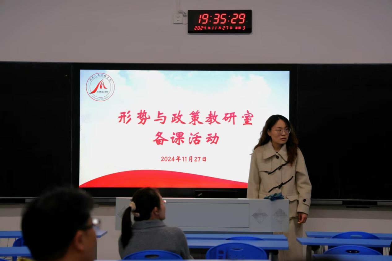 11月27日,马克思主义学院形势与政策教研室在若谷楼101教室开展了2024年下学期《形势与政策》集体备课活动,活动由形势与政策教研室主任孙淇庭主持,副院长成赛军和本学期担任形势与政策课教学的教师参加了此次活动。