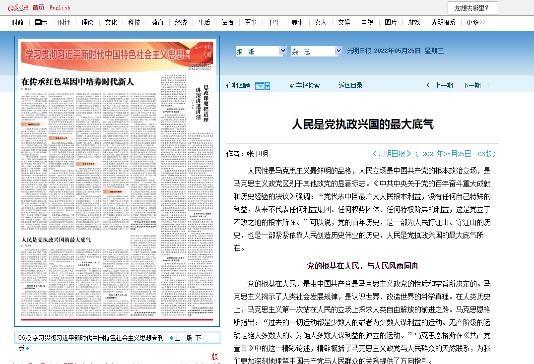 2022年5月25日,《光明日报》(理论版)刊发了我院院长、马克思主义理论省应用特色学科带头人、思想政治教育省一流专业负责人、中国特色社会主义理论体系研究中心beat365英国官网基地首席专家张卫明教授《人民是党执政兴国的最大底气》一文,这是张教授第六次在《光明日报》发表理论文章。