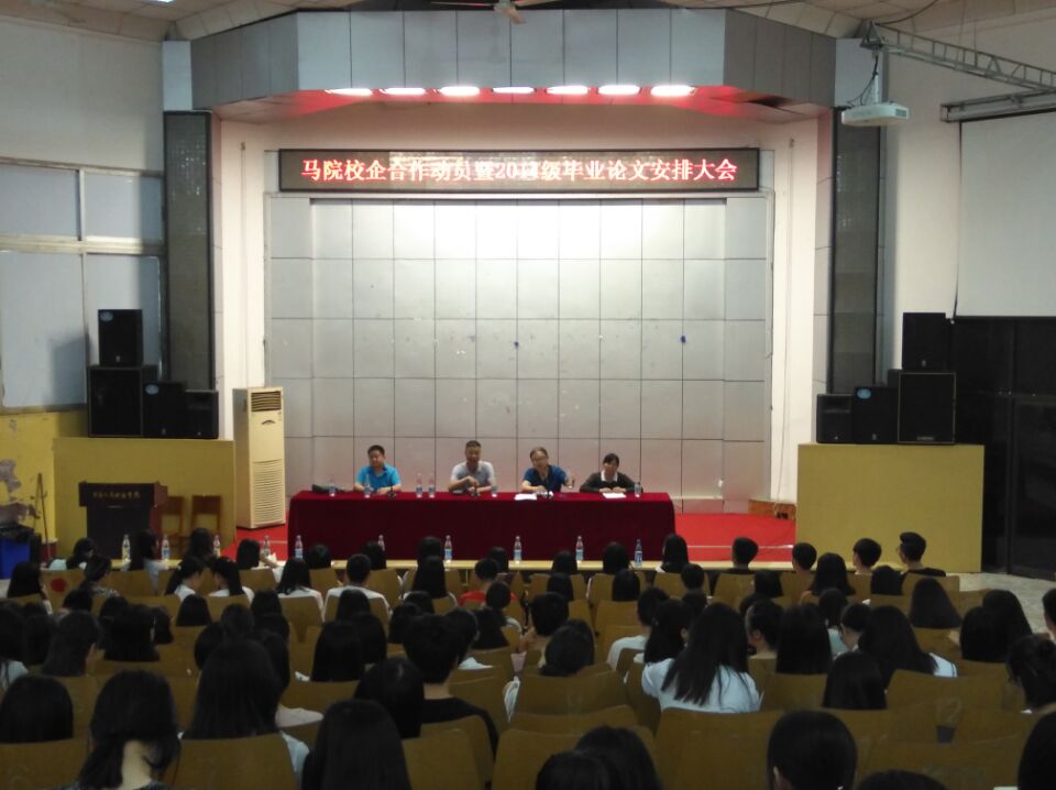 为推动校企合作进一步发展,毕业生论文顺利过关。6月12日,马克思主义学院在匠成楼报告厅举行校企合作动员大会暨2014级毕业论文安排大会。主持人为副院长陈灿芬。我院院长范大平、副院长杨国辉、思政教研室主任周玉珍,14、15以及16级全体学生共同参与本次会议。