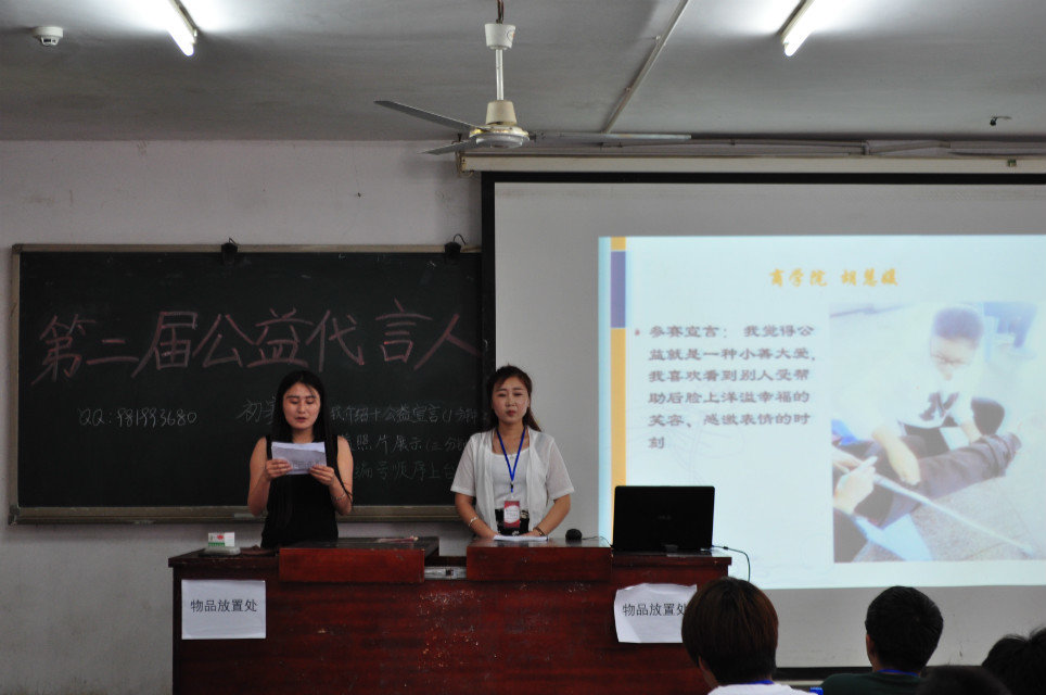 为了呼吁在校大学生积极参与公益活动、宣传公益理念,增强大学生的社会责任感、服务意识和奉献精神。 5月26日,马克思主义学院和大学生时事与政治研究会在致远楼520举行了以“寻找公益代言人,相约公益行”为主题的公益代言人评选活动。参与人员有马克思主义学院团学会和大研会的工作人员以及比赛选手,主持人为王莹和彭莎莎。