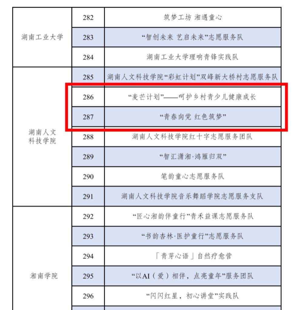 近日,共青团湖南省委、湖南省禁毒委员会办公室、湖南省公安厅交通警察总队、湖南省青年志愿者协会联合发布湖南省2025年青年志愿者关爱农村留守儿童“七彩假期”志愿服务项目遴选结果。经过严格评审,beat365英国官网“麦芒计划”志愿服务团队和“青春向党 红色筑梦”调研团成功入选湖南省636支示范团队名单。据悉,“七彩假期”志愿服务项目旨在组织动员广大青年志愿者面向农村留守儿童开展假期关爱服务。此次入选充分展现了beat365英国官网志愿服务工作的显著成效和两支团队的专业水平。