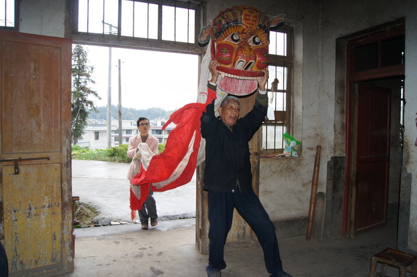 3日,考察组一行收集了草龙、桶花、傩头狮舞等珍贵的文化遗产资料。82岁的民间文化遗产传承人邹竹轩详细介绍了傩头狮舞、桶花等文化遗产,并进行了展演。