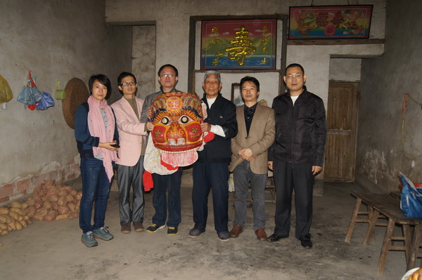 考察组一行与傩头狮子舞的传承人邹竹轩