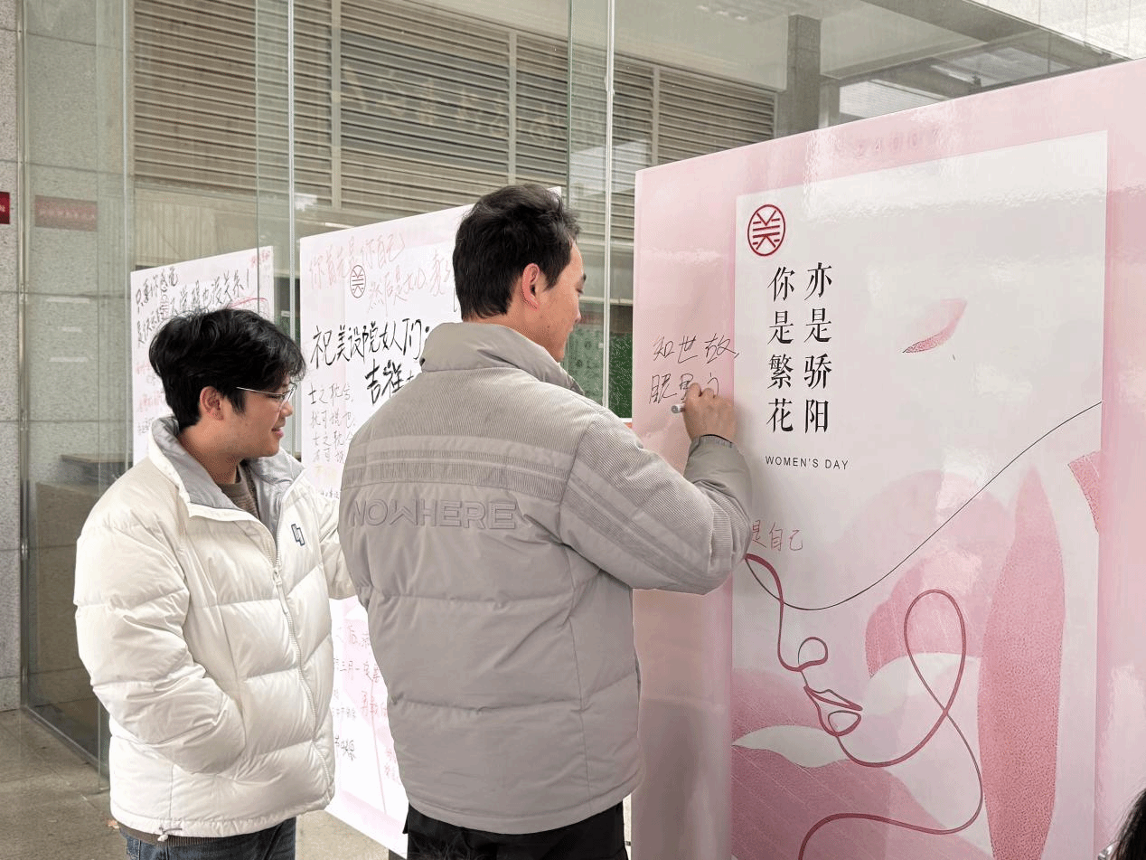 活动现场设置了数块留言板,诚邀每位参与者留下对女性的祝福或正能量寄语。大家热情高涨,在留言板上写下:“愿你心思清澈宛如少女,也能踏浪高歌自立为王”、“愿每一位女性都能活出自我,绽放独特光彩”、“愿你不惑于年龄,不困于身材,平等、骄傲、自由,一切美好皆属于你”……这些温暖人心的话语,如同一股股暖流,流淌在每个人的心间,传递着对女性的无限敬意与赞美。此外,活动还设置了鲜花领取环节。每位写下祝福的师生,均可领取一束精美的鲜花。手捧鲜花,大家的脸上洋溢着幸福的笑容,仿佛这鲜花也承载了他们对女性的美好祝愿和深深敬意。
