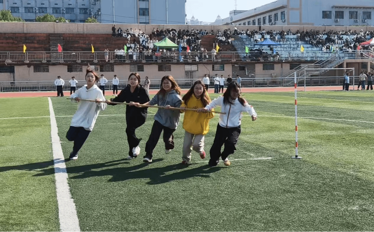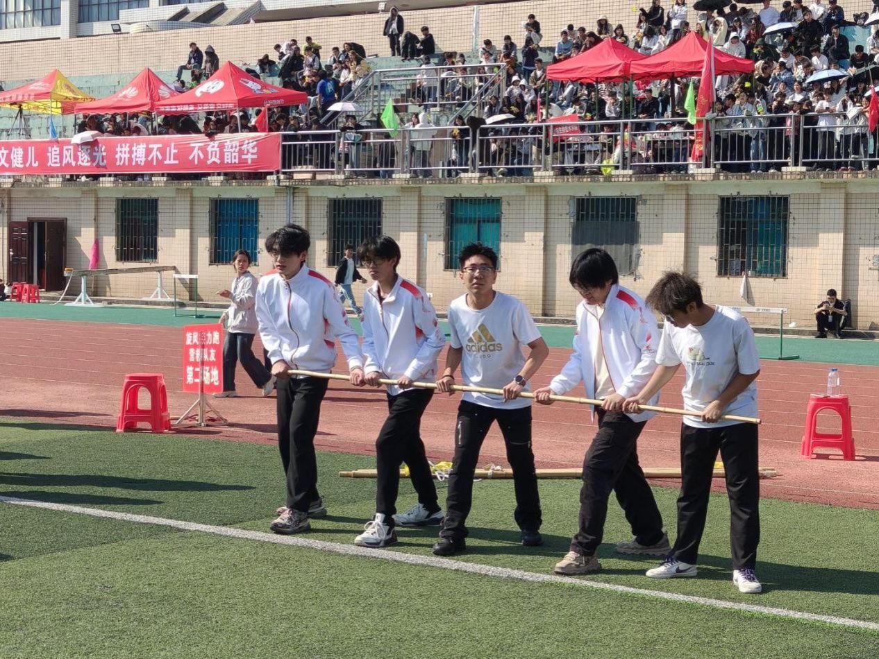 比赛当日,阳光洒满赛场,“人文健儿 拼搏不止”的横幅在看台格外醒目,观众助威声此起彼伏。发令枪响,第一组队员紧握长杆同步蹬地冲出,身体前倾、步幅一致,绕过标志杆后与第二组顺利交接。第二组队员迅速接杆完成接力,转入弯道时,内侧队员主动放慢半步调整节奏,外侧队员稍作加速保持平衡,握杆手臂始终保持同高,确保团队行进稳定。最终,第二组队员带着全队期盼冲过终点线,赛场瞬间响起阵阵欢呼,第七名的成绩实至名归。