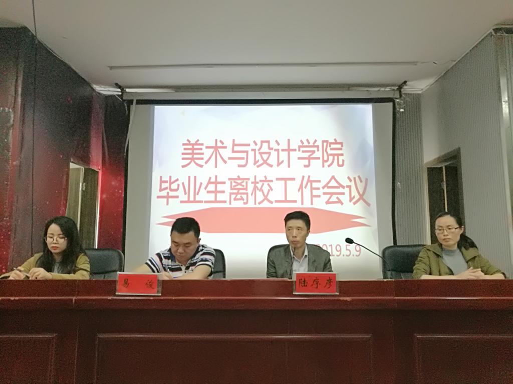 5月9日晚上,美术与设计学院在逸夫楼一楼报告厅召开了毕业生离校工作会议。学院党政领导谢光绎、陆序彦、易俊,全体辅导员老师,15级全体学生及毕业班班主任出席大会。