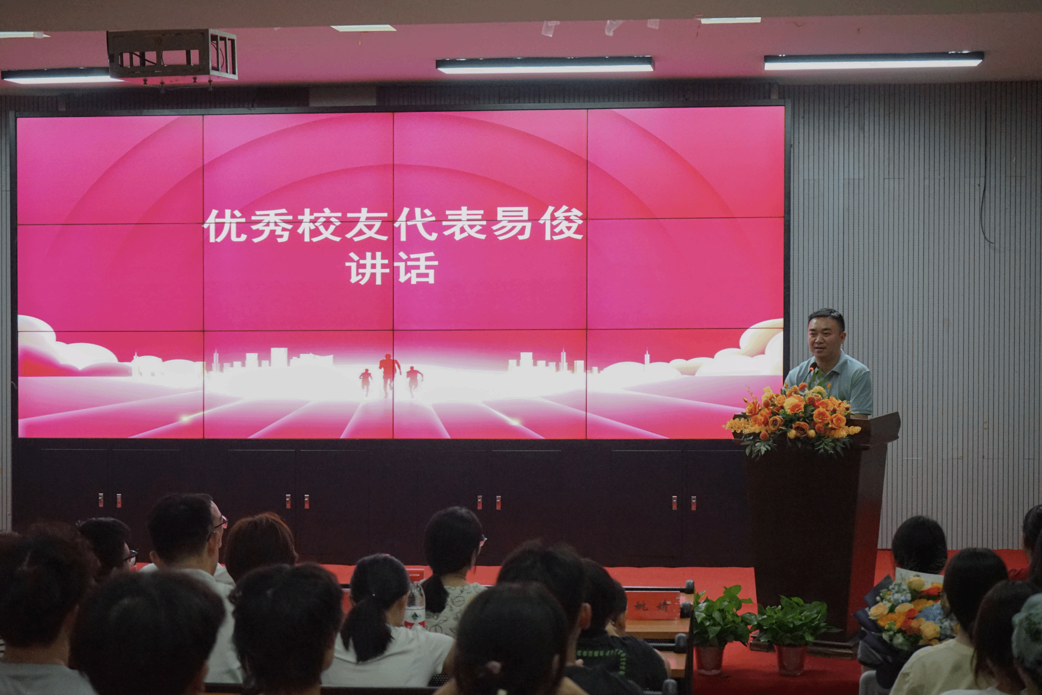 接着,优秀校友代表易俊发表讲话。易俊分享了他在大学期间的求学经历,鼓励同学们追求卓越、心怀感恩。同时,还强调了“立德树人”的观点,提醒同学们要合理规划自己的学习时间,要把“清单”列好,把“方法”找对。时常警醒自己、勉励自己。易俊的发言为新生们提供了宝贵的参考与启示。