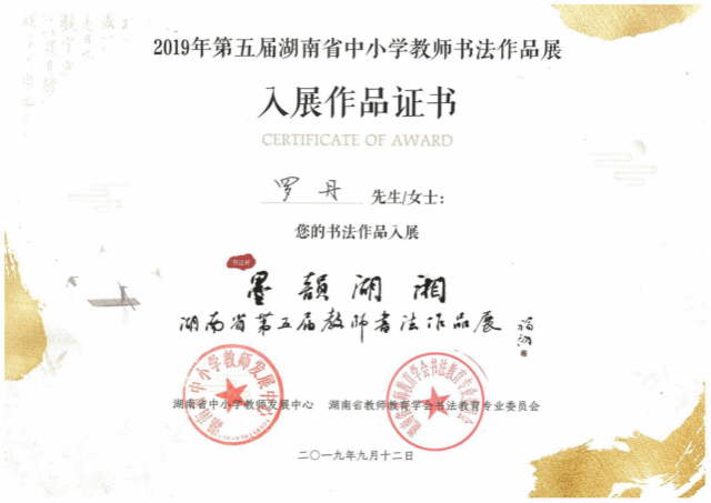书法作品入展“湖南省首届隶书展”、“第五届湖南省中小学教师书法展”、“第二届中国高等院校书画摄影艺术展”、“山西省第二届大学生书法篆刻展”等省市级赛事数十次。指导学生作品多次在教育部、湖南省教育厅举办的书法比赛中获奖,并获“优秀指导老师奖”。