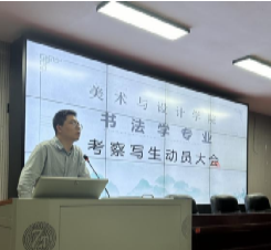9月24日晚上8点,美术与设计学院书法学专业的师生们齐聚逸美楼一楼报告厅举行专业考察写生动员大会,本次大会由书法教研室主任李国清主持,书法教研室的全体带队老师参加。