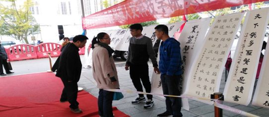 此次“文化进社区”活动展演的作品是由美术系学生党员精心进行创作而成,含国画、书法、水彩、版画等多个种类。湖南省第六届湘博会、娄底市第四届娄商大会、娄底市第六届房交会都于11月6日——8日在娄底市体育中心举行,会场人流如织。许多参观购物者对我系学生作品表现出浓厚的兴趣,观赏者、询问者、申请义购者不可胜数,外国客人对神秘的东方书画艺术充满好奇,来到我们的书画作品前兴味盎然地合影留念。到11月7日下午展览结束,教师和学生们都累得不行,但大家都不叫累,都为我们的学生作品吸引和感染群众感到无比的喜悦。