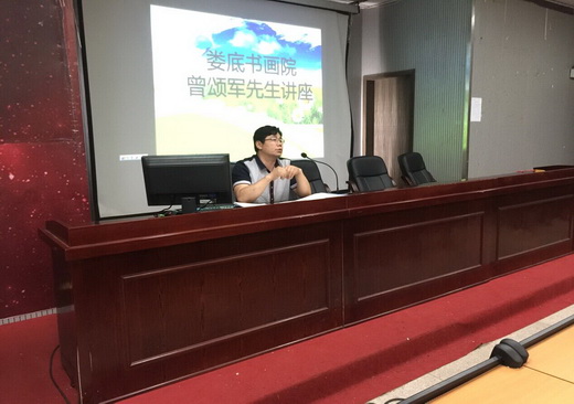 7月6日上午8:30,书法学教研室邀请娄底书画院董事长曾颂军先生到我系做以“书画展的策划与运作”为主题的讲座。讲座由书法学专业教师杨金榜主持, 14级书法学专业全体学生和带队教师参加了讲座。